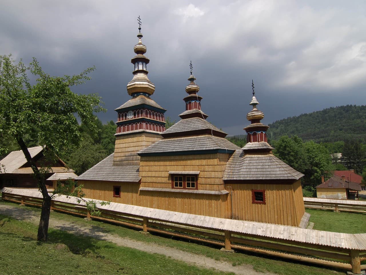 Zrekonštruovaný drevený gr.kat. kostolík Ochrany Presvätej Bohorodičky z Mikulášove v Múzeu ľudovej architektúry v Bardejov (Zdroj: TASR - Milan Kapusta)