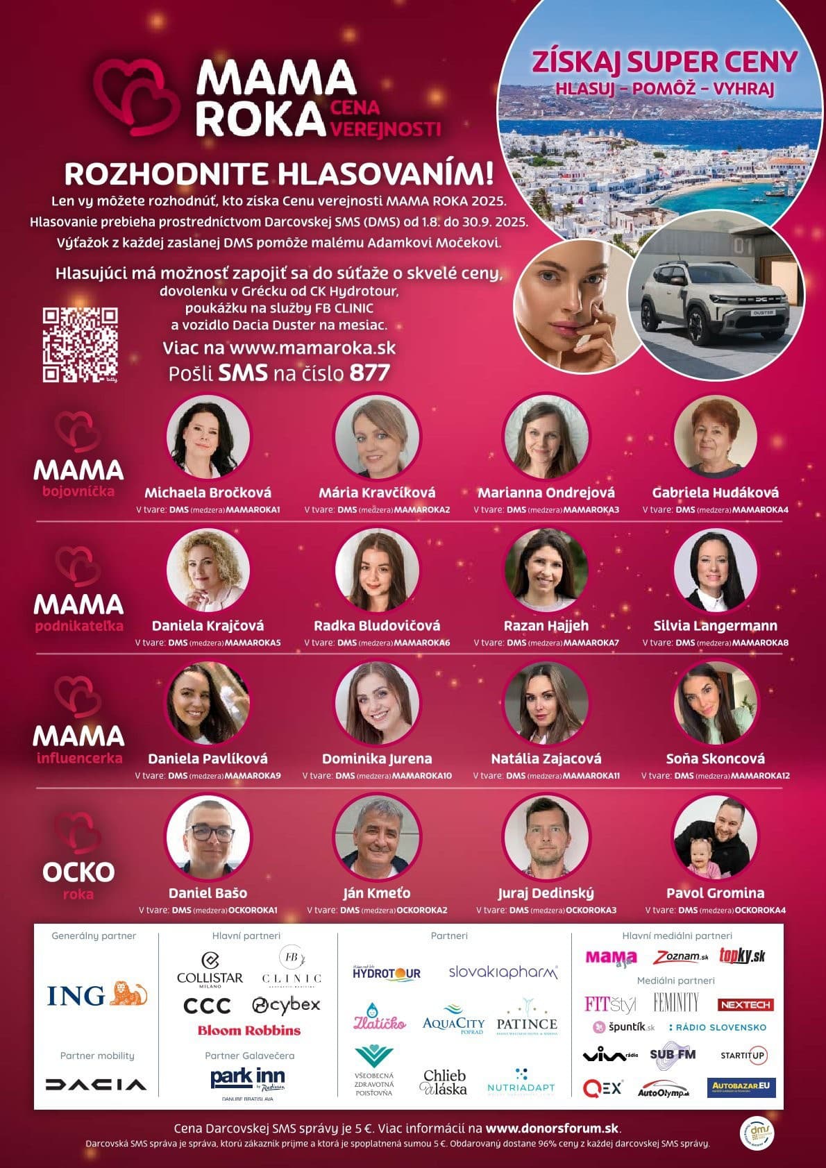 Občianske združenie MAMA ROKA organizuje už šiesty ročník výnimočnej ankety MAMA ROKA 2025. Pod záštitou solidarity, rodinných hodnôt a autentických príbehov hľadáme tiché hrdinky a hrdinov bežného života, ktorí si zaslúžia viac než len uznanie. V uplynulom ročníku sme vďaka podpore partnerov a verejnosti odovzdali rodinám finančnú pomoc vo výške takmer 11 000 € a nefinančnú podporu viac ako 23 000 €. Generálny partner ankety ING Hubs Slovakia venuje tento rok víťazke v ankete MAMA ROKA 2025 finančnú podporu vo výške 5 000 € ako konkrétny prejav úcty a ocenenia. Hlavným partnerom kategórie Cena verejnosti je FB CLINIC.