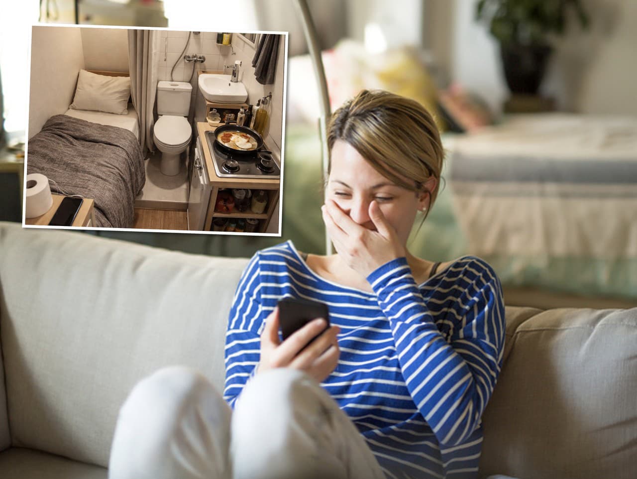 Zaujal však opis: „Všetko máte na skok: aj záchod, aj kuchyňu.“ Fotografia interiéru ukazuje, ako sú posteľ, toaleta, sprcha, umývadlo aj kuchynská linka natlačené v jednom miniatúrnom priestore.