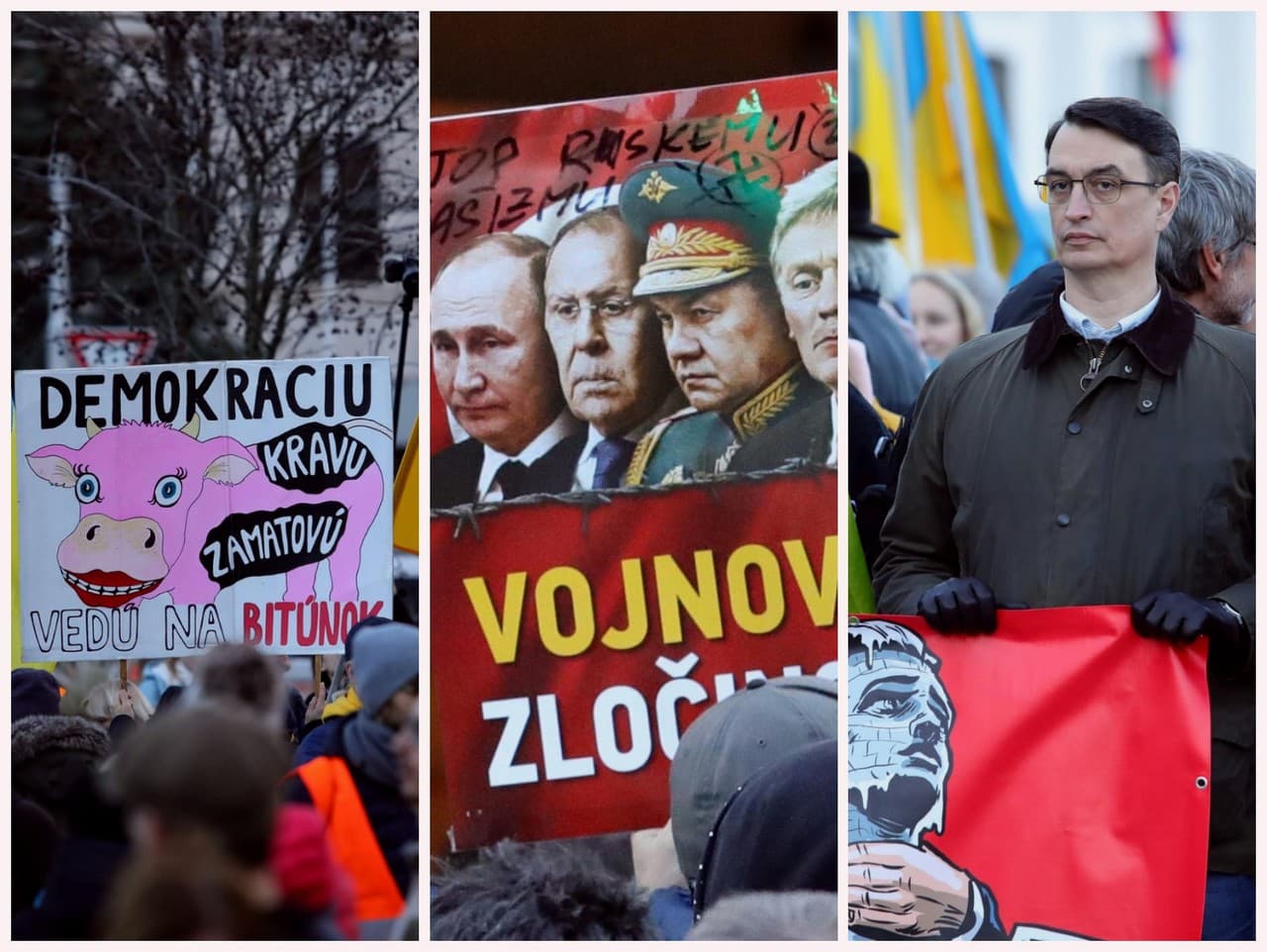 Na pochode nechýbajú povedomé tváre zo skorších protestov v gescii Mier Ukrajine, jeden z transparentov dokonca drží partner bývalej prezidentky Zuzany Čaputovej Juraj Rizman. Ten sa angažuje v občianskom združení Post Bellum.