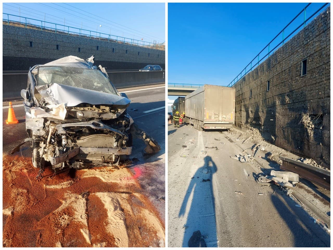 NITRA - Na rýchlostnej ceste R1 pri Nitre došlo v piatok ráno k vážnej nehode, keď do odstaveného osobného auta narazil kamión len chvíľu po tom, čo jeho vodič vystúpil, aby umiestnil výstražný trojuholník. Podľa svedkov vyzeral náraz mimoriadne hrozivo a poškodil aj protihlukovú stenu.