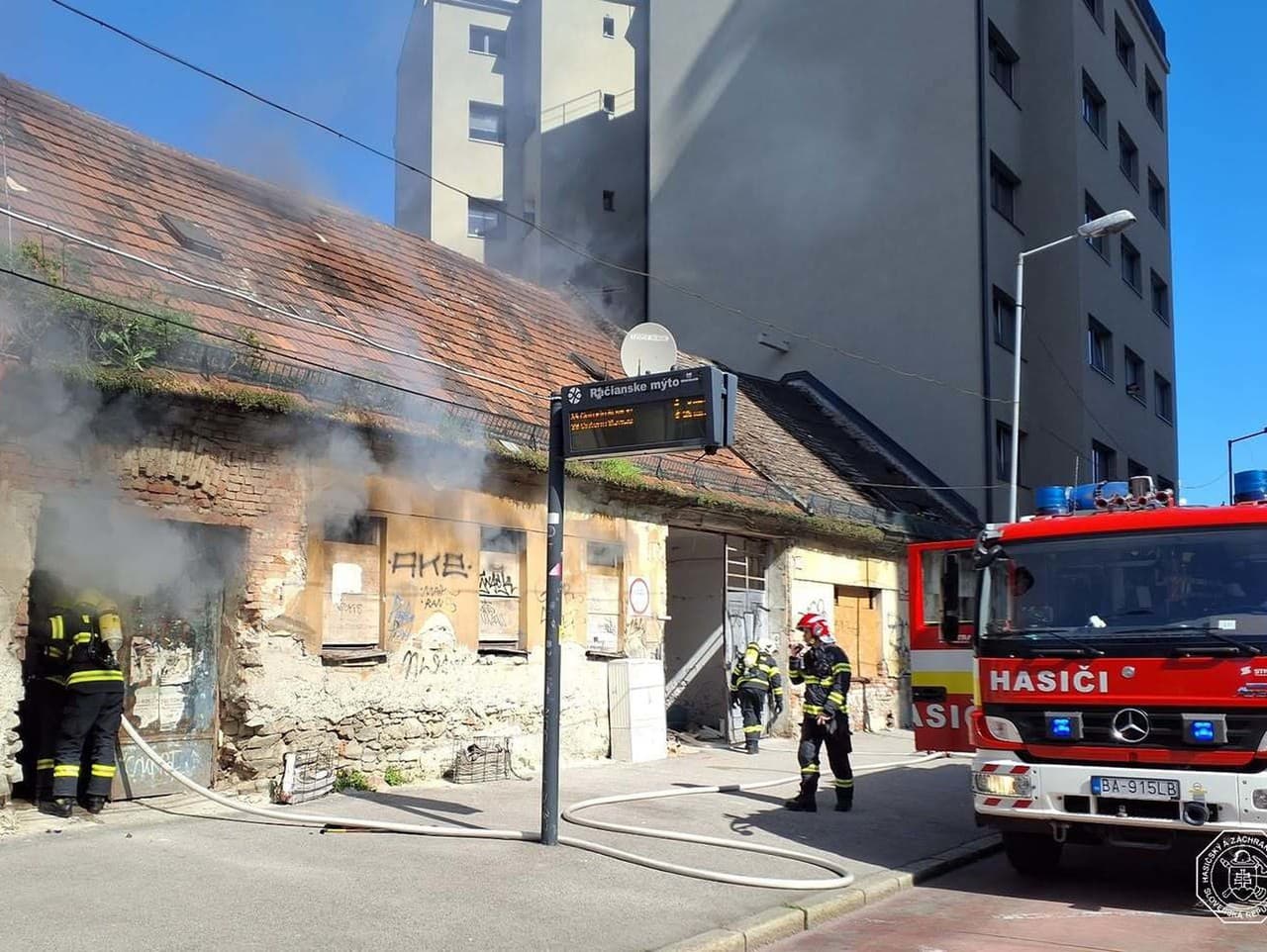 Hasiči zasahujú pri požiari na streche opustenej budovy v Bratislave. (Zdroj: Facebook/Hasičský a záchranný zbor)