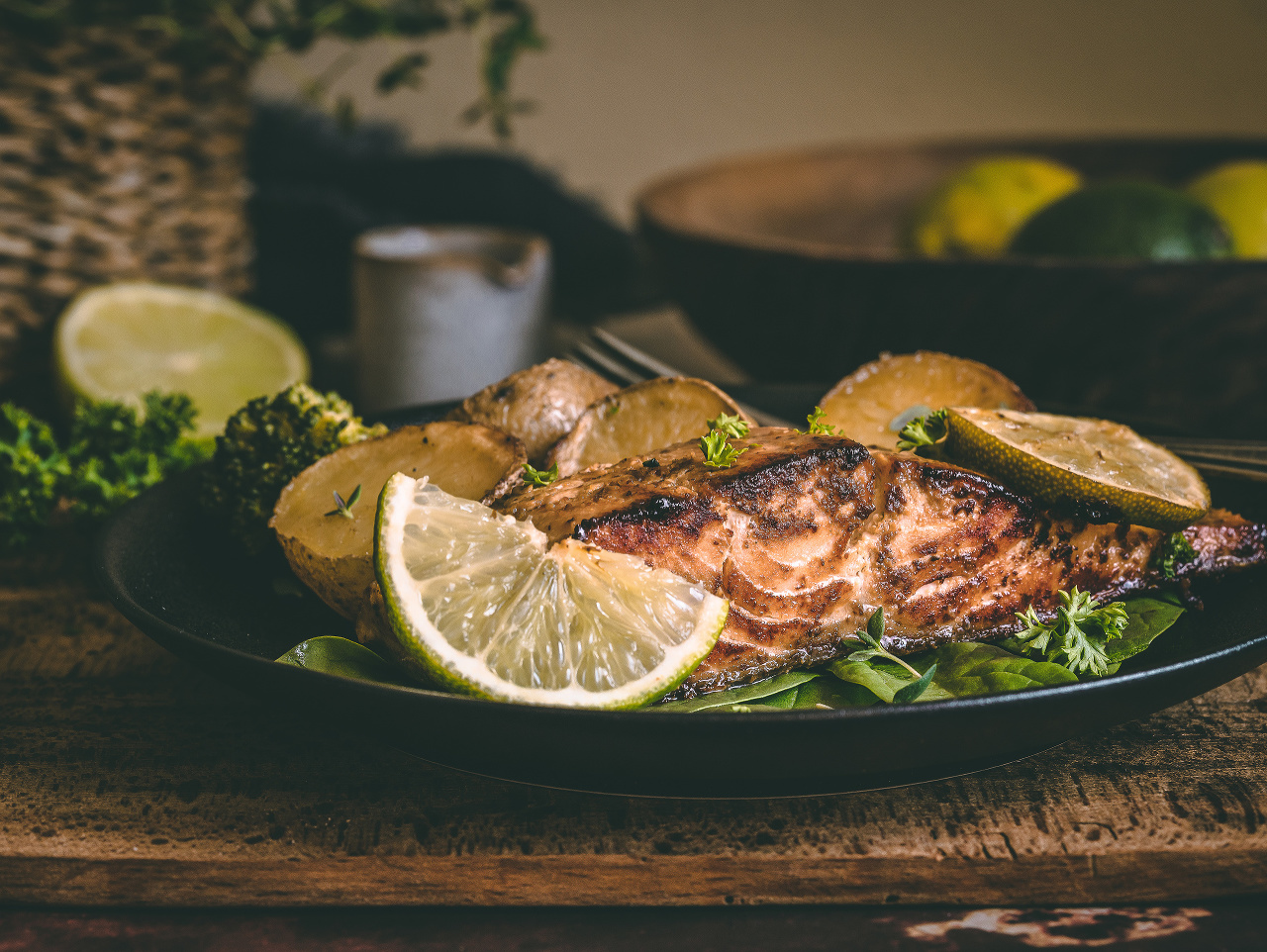 Umyté zemiačiky prekrojte na polovicu, zmiešajte s olivovým olejom, soľou, mletou červenou paprikou a rozprestrite v zapekacej nádobe prekrojenou časťou nadol. Vložte do vyhriatej rúry a pečte na 200°C cca hodinu. Medzitým si pripravte marinádu. Zmiešajte horčicu, med a olivový olej, pridajte soľ, čierne korenie a potrite ňou kúsky lososa z každej strany. Nechajte pôsobiť pol hodinu.