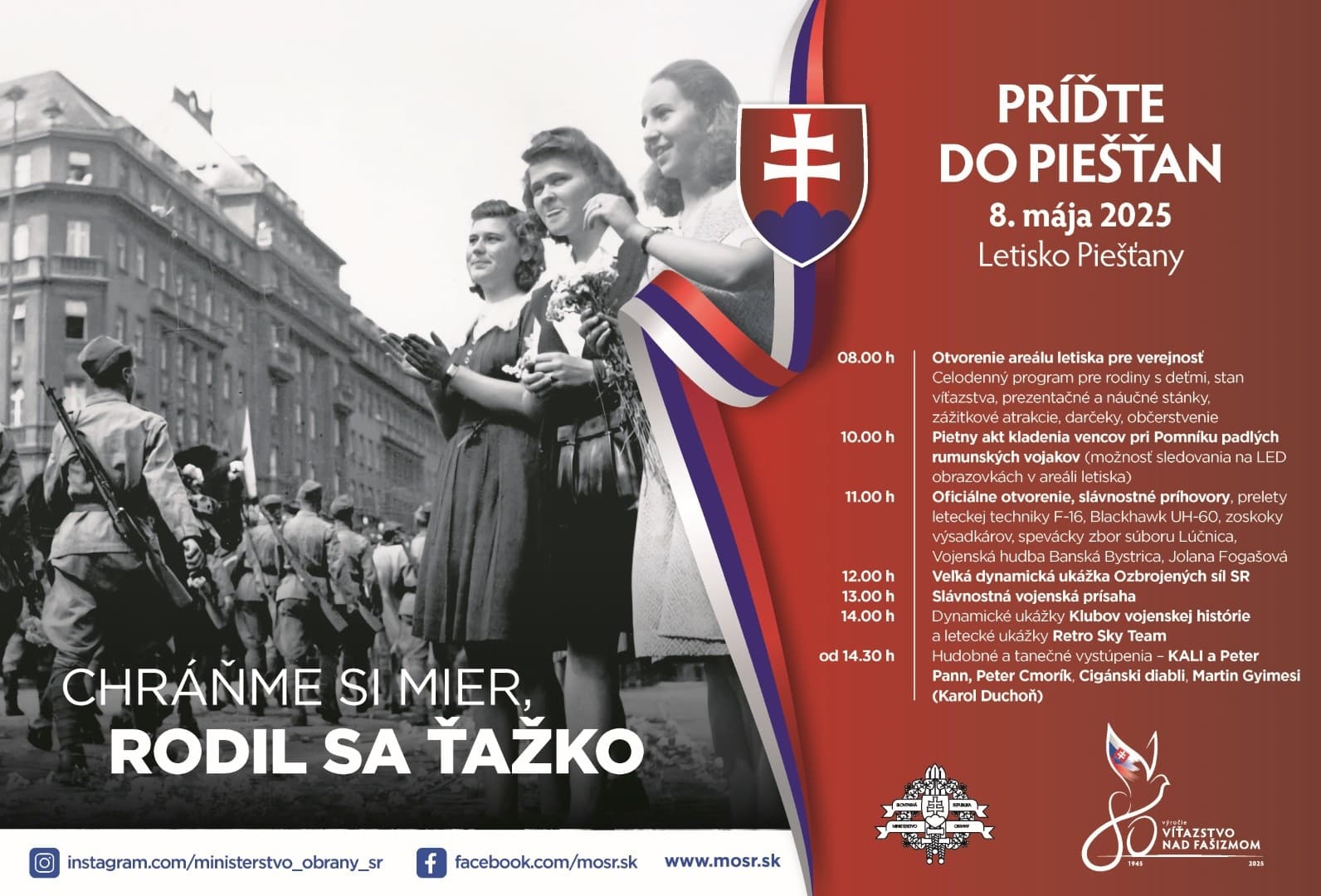 Oslavy sa nesú v znamení histórie, viery i piety, preto si myslím, že práve takéto atraktivity tu majú svoje miesto. Stan víťazstva s dobovými fotografiami bude obohatený dobovými filmami z bojov 2. Svetovej vojny a pozvanie prijala napríklad aj známa slovenská etnologička Katarína Nádaská, ktorá sa návštevníkom prihovorí s unikátnou diskusnou témou: Keď front prešiel dedinou – ľudová tvorivosť a rituály vo vojnových časoch. Už od 8.30h sa v poľnej kaplnke v areáli letiska uskutoční ekumenická pastoračná Bohoslužba a duchovní budú k dispozícii aj v pastoračnom stane na rozhovory, modlitby a spovede počas celého dňa.