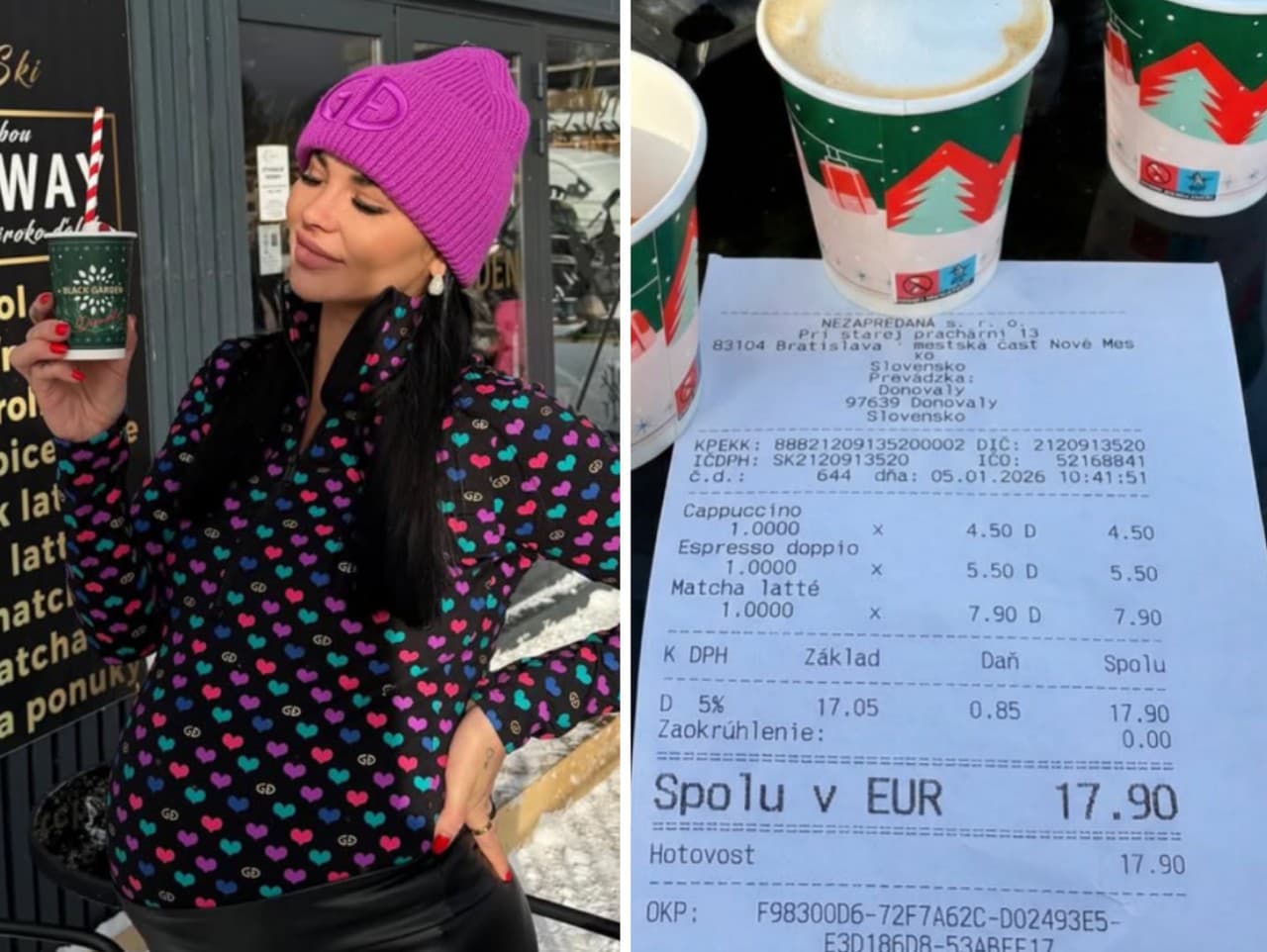 „Tento veľmi tajomný človek prišiel, objednal si kávy, matchu a pohoršil sa na cene. Je to na svahu, takže je jasné, že to asi bude o niečo drahšie. Ja som prišla na Donovaly s mojím bratislavským nápojovým lístkom, ten istý, čo proste mám všade, a musela som ho zmeniť, pretože tam funguje taká tá politika, že musíš mať rovnaké ceny ako aj ostatné bary, ktoré tam sú," vysvetlila.