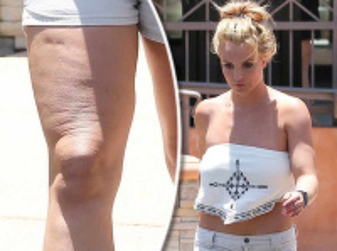 Na takéto výstrelky by mala veľmi rýchlo zabudnúť! Zakaždým, keď sa v mekke americkej kinematografie oteplí, Britney Spears vytiahne zo šatníka svoje milované šortky. So železnou pravidelnosťou však bez mihnutia oka ukáže aj to, za čo by sa jej kolegyne išli prepadnúť od hanby. Dvojnásobná mamička už po niekoľký raz pretŕčala hrubé nohy obrastené nepeknou celulitídou. A pridala aj bonus v podobe otrasného topu.