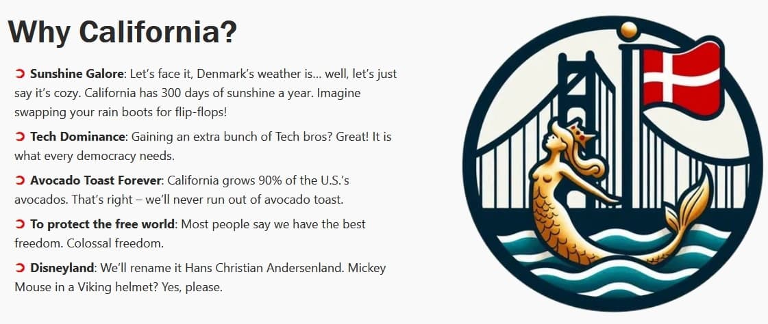Aj keď zrejme ide o satirický počin, ktorý sa dá porovnať s niekdajšou "kauzou" Královec, aktivisti s názvom "Denmarkcifikácia" si na svojom webe kladú rôzne odpovede na to, prečo by bolo výhodné "kúpiť Californiu pre Dánsko".