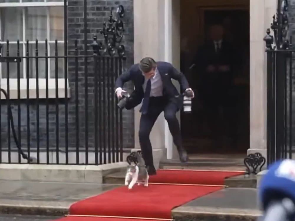 Z ikonických dverí sídla britských premiérov sa totiž na scénu ešte predtým vybral slávny domáci obyvateľ. Jeden fotograf o neho tamer zakopol, ako ukazuje video.