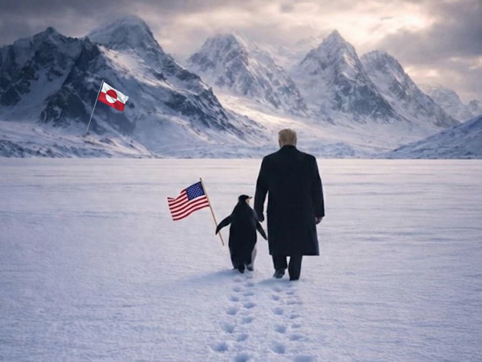 Príspevok, na ktorom Trump v čiernom kabáte prechádza hornatou zasneženou krajinou s tučniakom držiacim americkú vlajku a na ktorom je v diaľke zapichnutá vlajka Grónska, Biely dom opatril popiskom " Objímte tučniaka". Redakcia serveru Newsweek sa obrátila na Biely dom so žiadosťou o komentár.