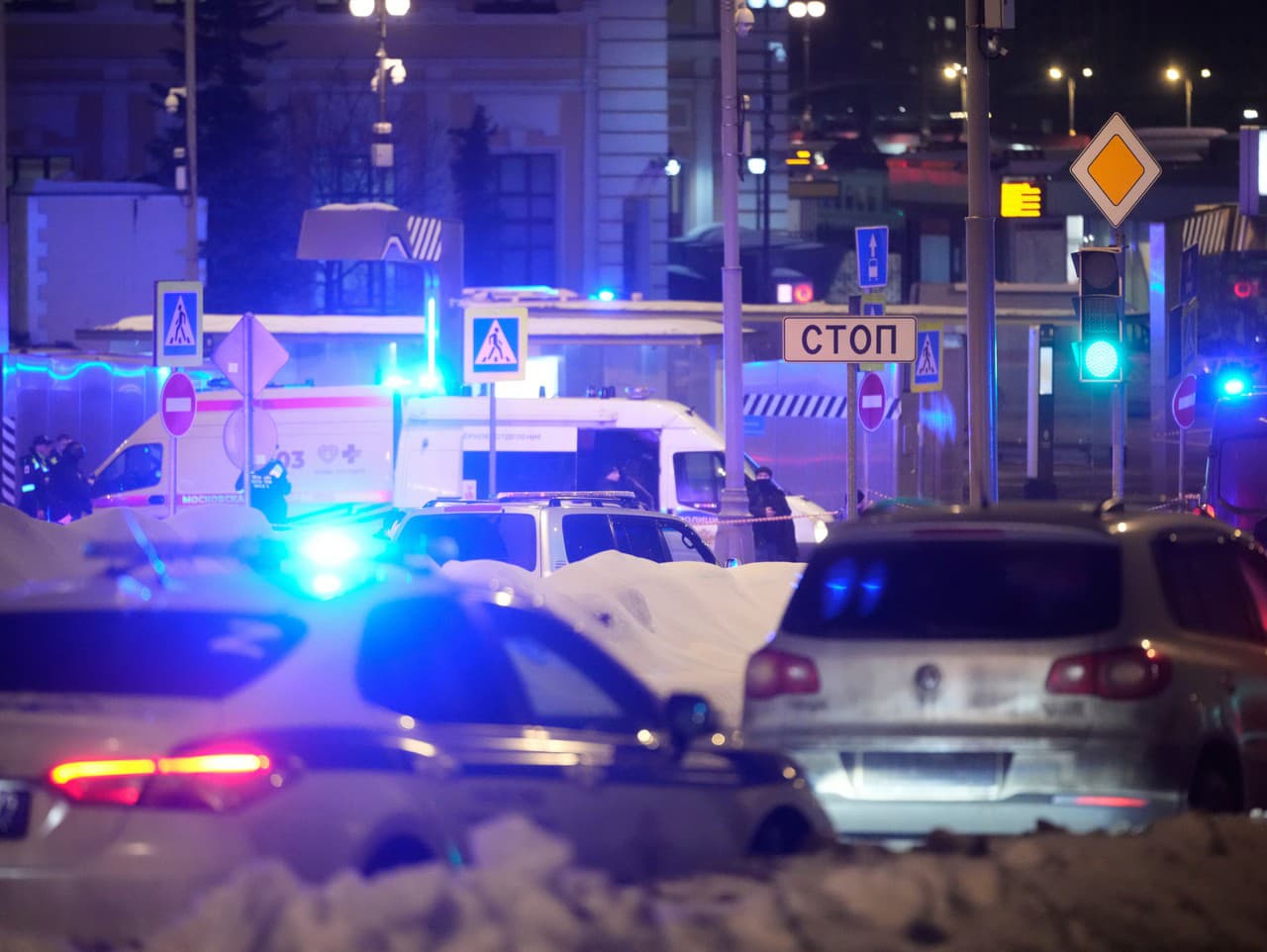 Polícia a záchranné zložky na mieste útoku na policajnú hliadku neďaleko železničnej stanice Savjolovskij v Moskve v utorok 24. februára 2026 (Zdroj: SITA/AP)
