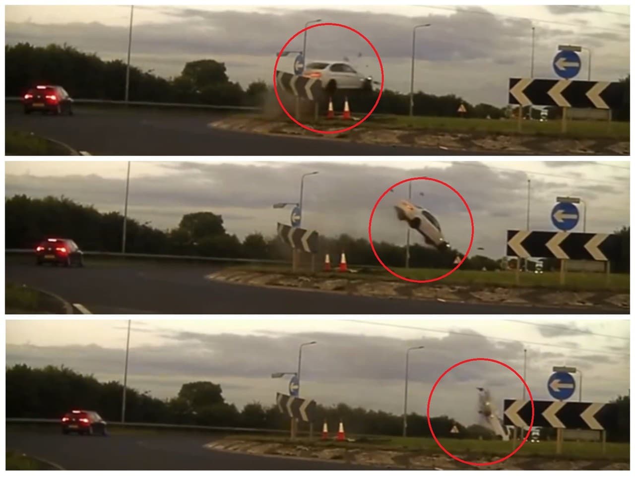 Policajné zábery z palubnej kamery zachytávajú moment, keď vozidlo vo vysokej rýchlosti naráža do okraja kruhového objazdu, odráža sa do vzduchu, rotuje v priestore a dopadá na druhú stranu cesty. BMW pristálo na kapote a následne sa niekoľkokrát prevrátilo, kým sa nezastavilo v živom plote.
