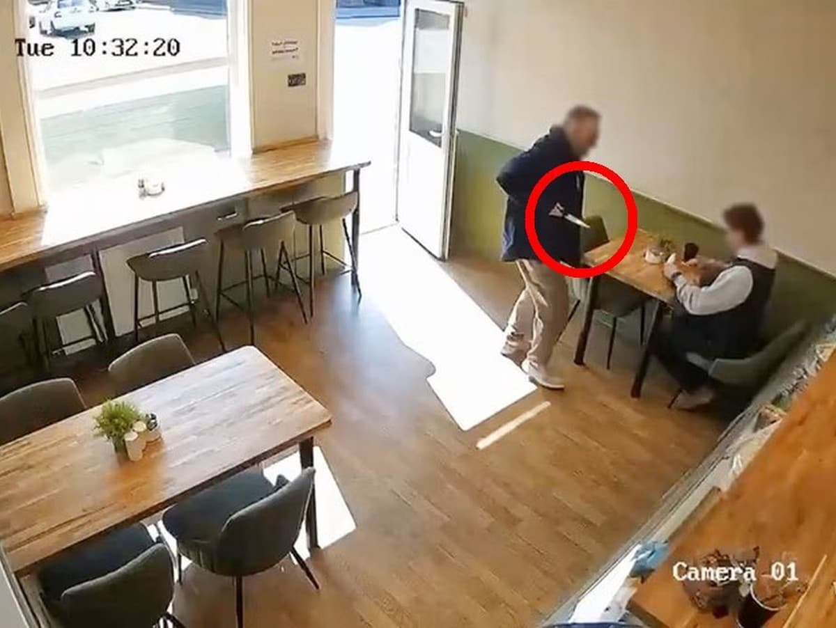 Incident sa stal v podniku The Deli na ulici Tonge Moor Road. Záznam ukazuje, ako muž vstupuje do kaviarne s nožom a bez varovania sa vrhá na zákazníka sediaceho pri stole.