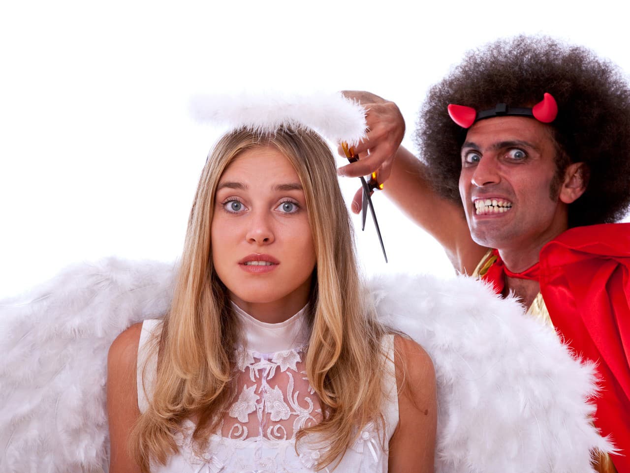 ugly devil and beautiful angel fighting on white