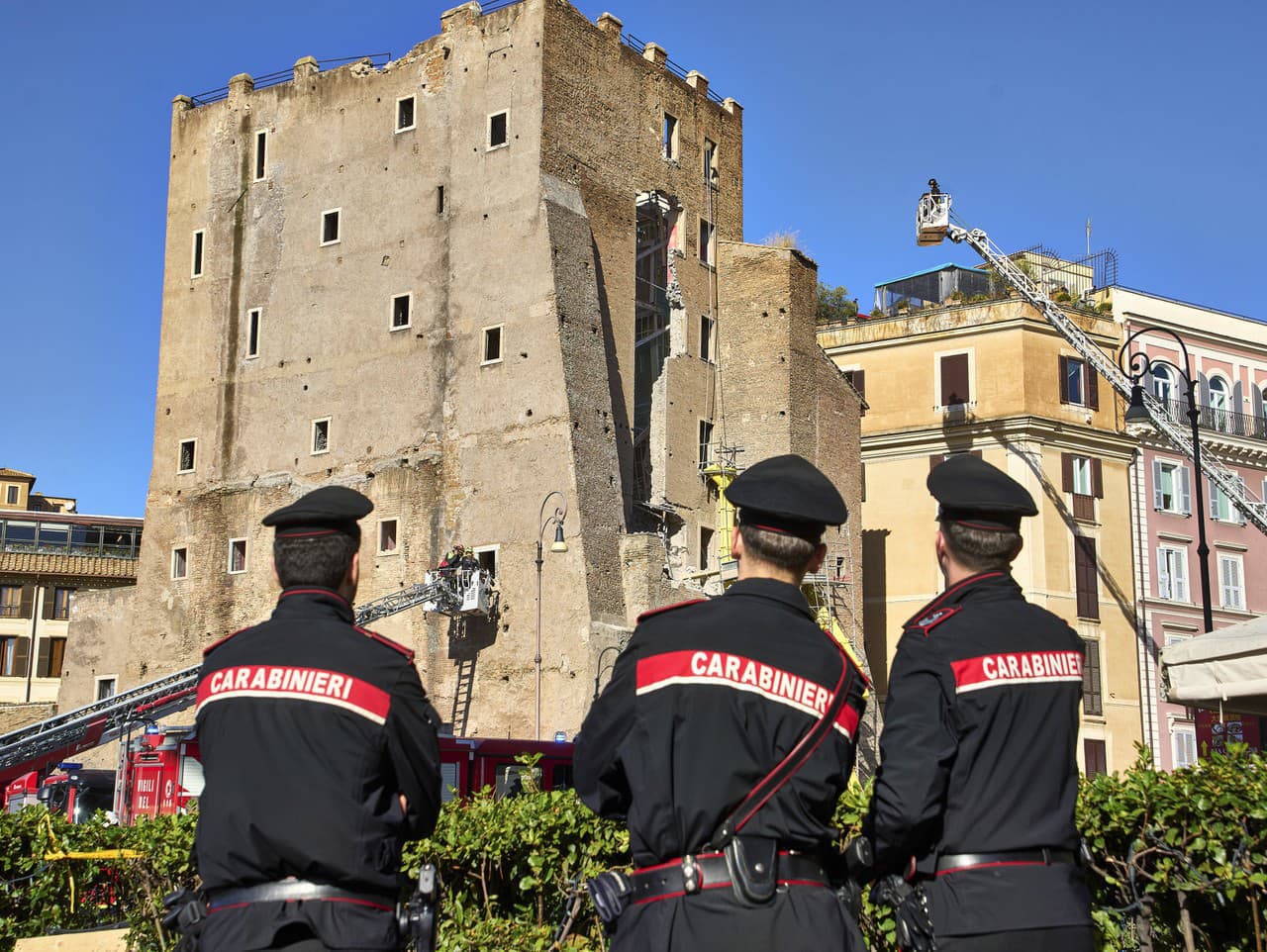 V centre Ríma neďaleko Kolosea sa včera dopoludnia zrútila časť stredovekej veže Torre dei Conti. Po prvom kolapse nasledoval ďalší, ktorý nastal, keď na mieste už boli záchranári. Tým sa najprv podarilo vytiahnuť zo sutín troch zranených robotníkov, ale pred vyslobodením štvrtého človeka sa zrútila ďalšia časť budovy.