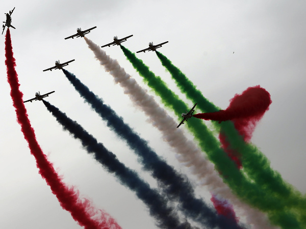 Akrobatické tímy Spojených arabských emirátov predvádzali svoje umenie na otváracom ceremoniáli Medzinárodnej exhibícii obrany