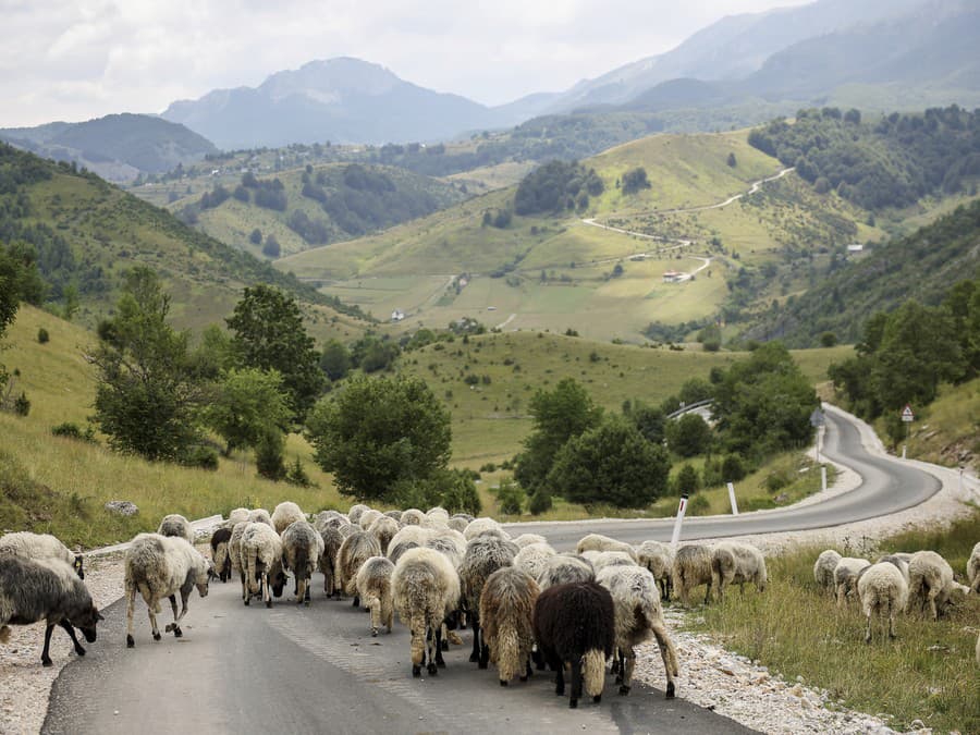 Stádo oviec zastavuje dopravu na ceste neďaleko obce Umoljani v pohorí Bjelašnica.